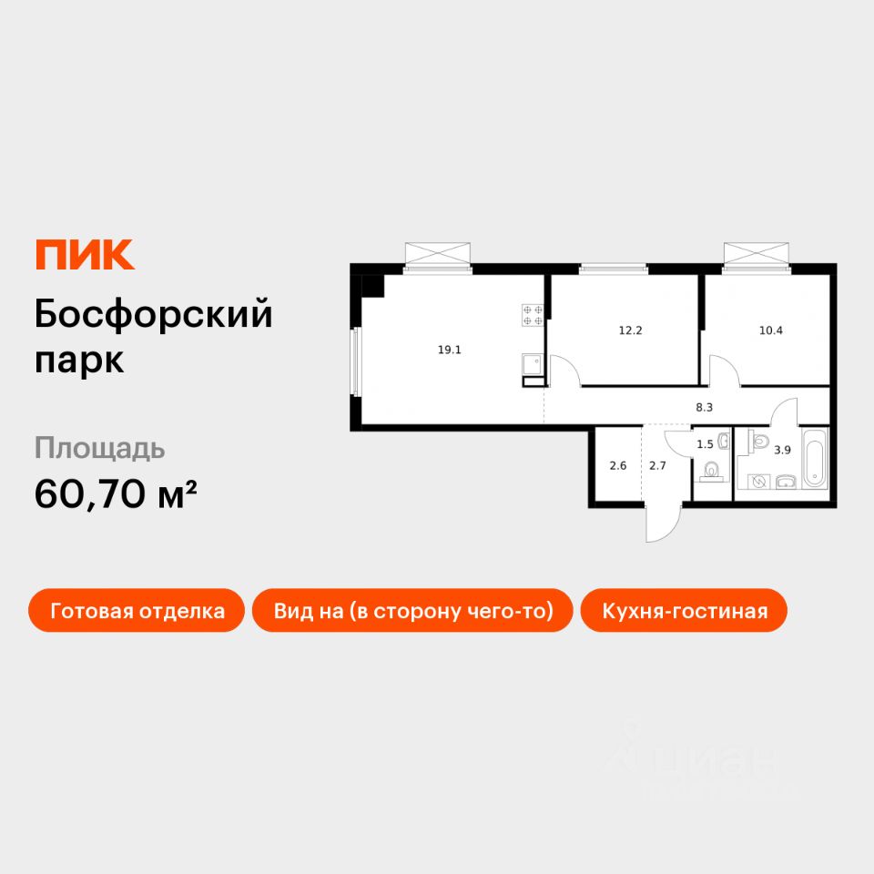 Продаётся 2-комн. квартира площадью 60,7 кв.м на 8 этаже 9 этажного дома (Корпус 4, Секция 1) проекта ПИК Босфорский парк. Светлый просторный подъезд на уровне земли, функциональная планировка, большие окна, c отделкой.