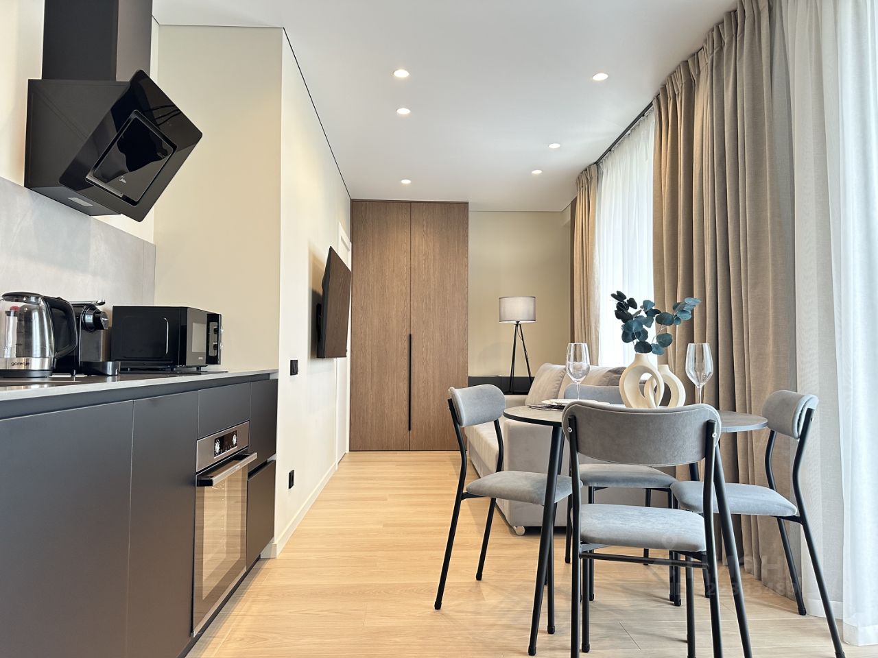 Квартира выполнена в дизайнерском стиле, что подчеркнет вашу индивидуальность. В комнате есть вся необходимая мебель для комфортного проживания. Кухня оборудована современной техникой: кондиционер, холодильник, посудомоечная машина и телевизор. Ванная комната с ванной и стиральной машиной обеспечит удобство в повседневной жизни.