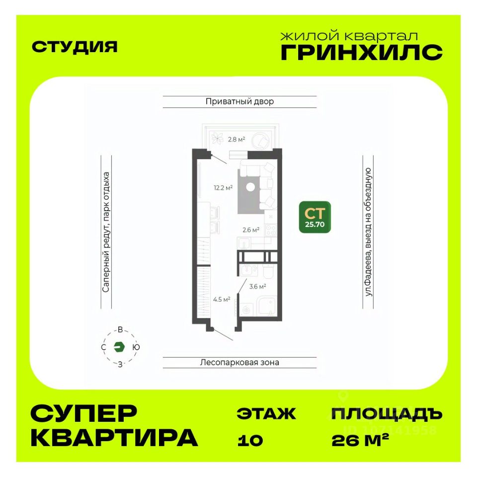 Продается студия с черновой отделкой в ЖК ''Гринхилс''. Общая площадь квартиры — 26 кв. м, этаж 10 из 19. Тип дома — монолитный. Цена указана при 100% оплате.
