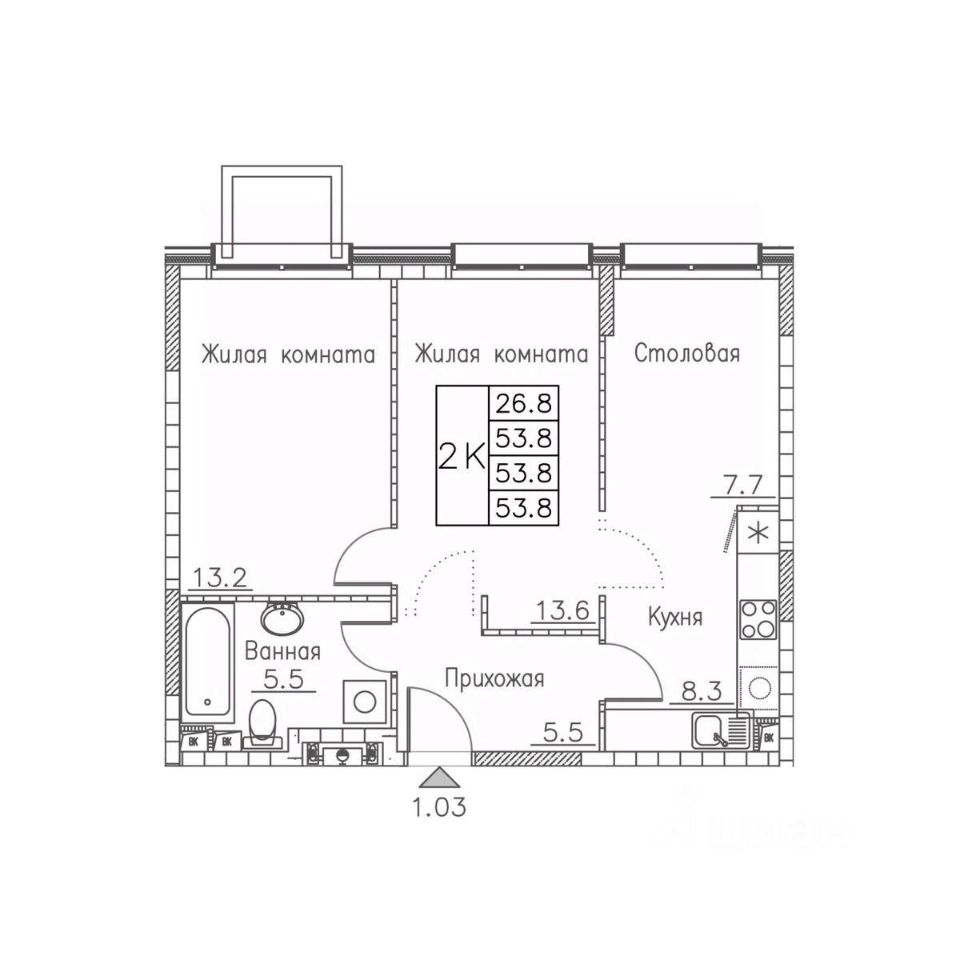 Общая площадь53,8 м2