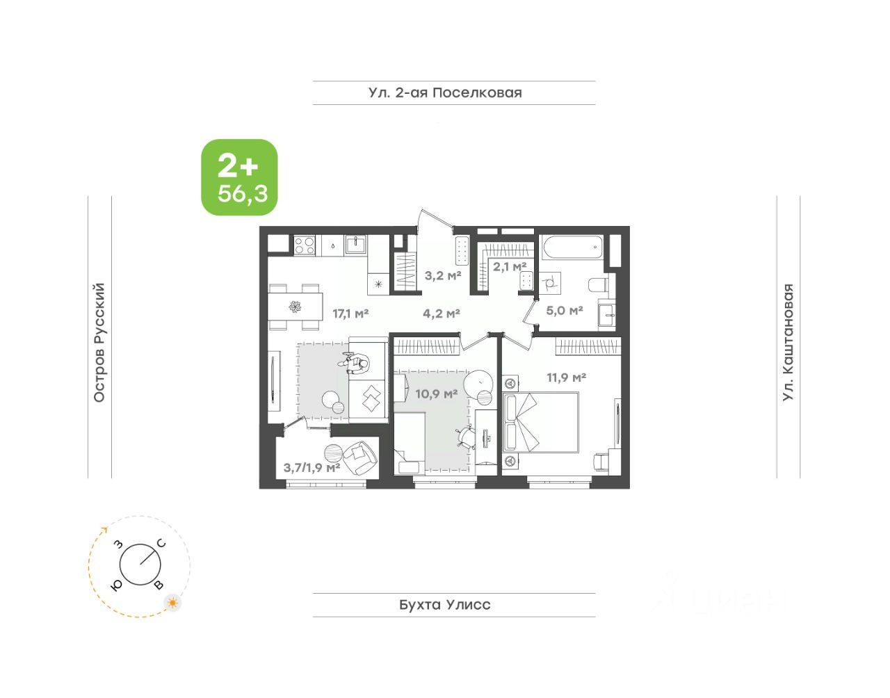 Идеальная квартира для молодой семьи Кухня-столовая 17,1 кв.м для семейных завтраков и ужинов Просторная родительская спальня 11,9 кв.м с выходом на лоджию, где можно наслаждаться свежим воздухом Уютная детская комната 10,9 кв.м для занятий учебой и отдыха Прихожая 3,2 кв.м с местом под шкаф-купе Ванная комната 5 кв.м в удобном расположении для всех членов семьи