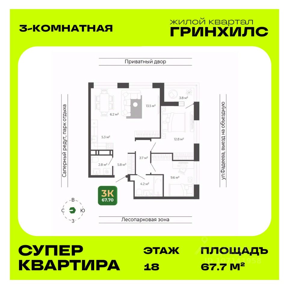 Продается 3-к квартира в ЖК ''Гринхилс''. Отделка - whitebox, санузел - под ключ. Общая площадь квартиры — 67.7 кв. м, этаж 18 из 19. Тип дома — монолитный. Цена указана при 100% оплате.