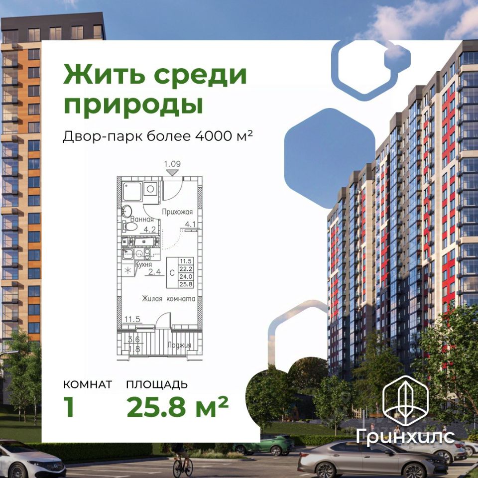 Продается студия в ЖК ''Гринхилс''. Отделка - whitebox, санузел - под ключ. Общая площадь квартиры — 25.8 кв. м, этаж 18 из 18. Тип дома — монолитный. Цена указана при 100% оплате.