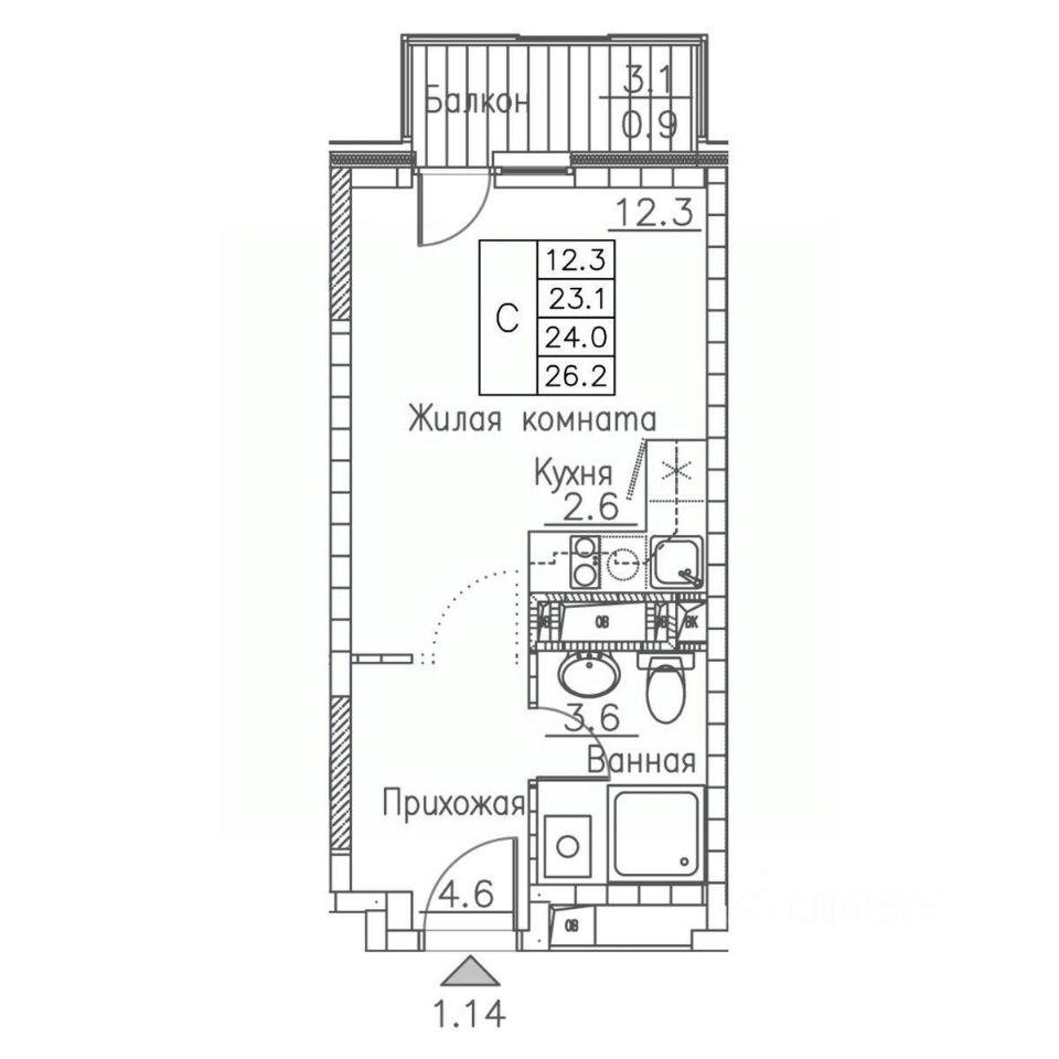 Общая площадь26 м2