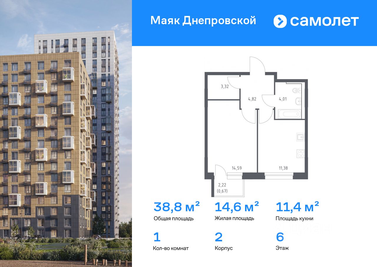 Строим кварталы для жизни с заботой о будущем. Предлагается 1-комнатная квартира комфорт-класса 38,79 кв.м в корпусе 2 на 6 этаже, в ЖК ''Маяк Днепровской'' Квартира без отделки. Доступность опции ''отделка'' и возможность комплектации мебелью и декором уточняйте у застройщика.
