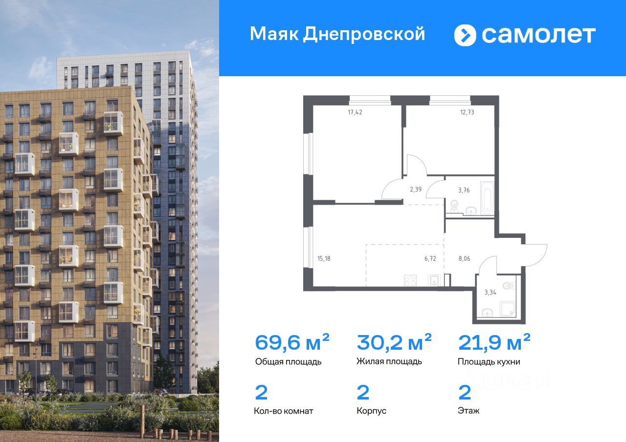 Строим кварталы для жизни с заботой о будущем. Предлагается 2-комнатная квартира комфорт-класса 69,6 кв.м в корпусе 2 на 2 этаже, в ЖК ''Маяк Днепровской'' Квартира без отделки. Доступность опции ''отделка'' и возможность комплектации мебелью и декором уточняйте у застройщика.