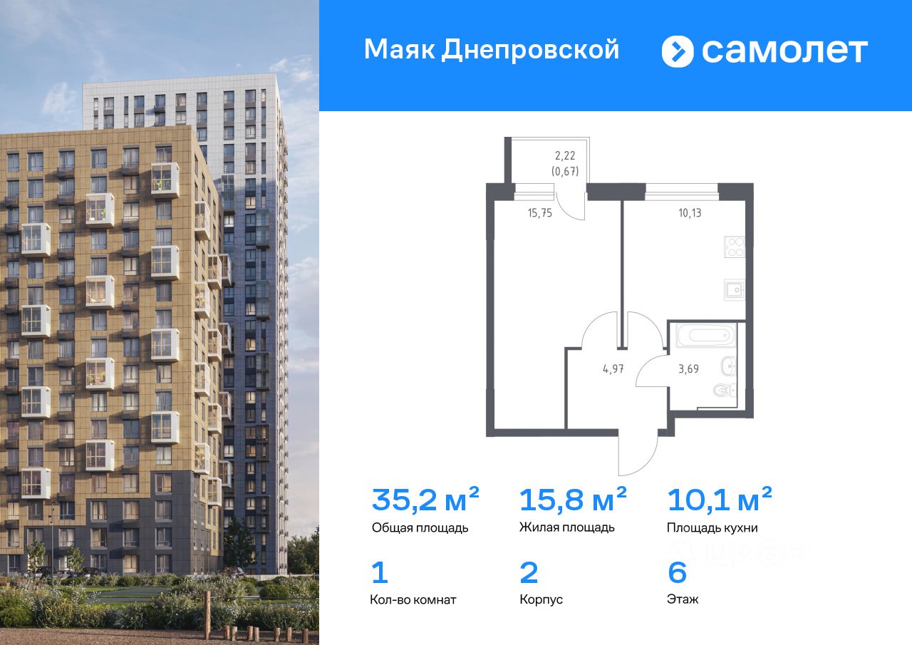 Строим кварталы для жизни с заботой о будущем. Предлагается 1-комнатная квартира комфорт-класса 35,21 кв.м в корпусе 2 на 6 этаже, в ЖК ''Маяк Днепровской'' Квартира без отделки. Доступность опции ''отделка'' и возможность комплектации мебелью и декором уточняйте у застройщика.