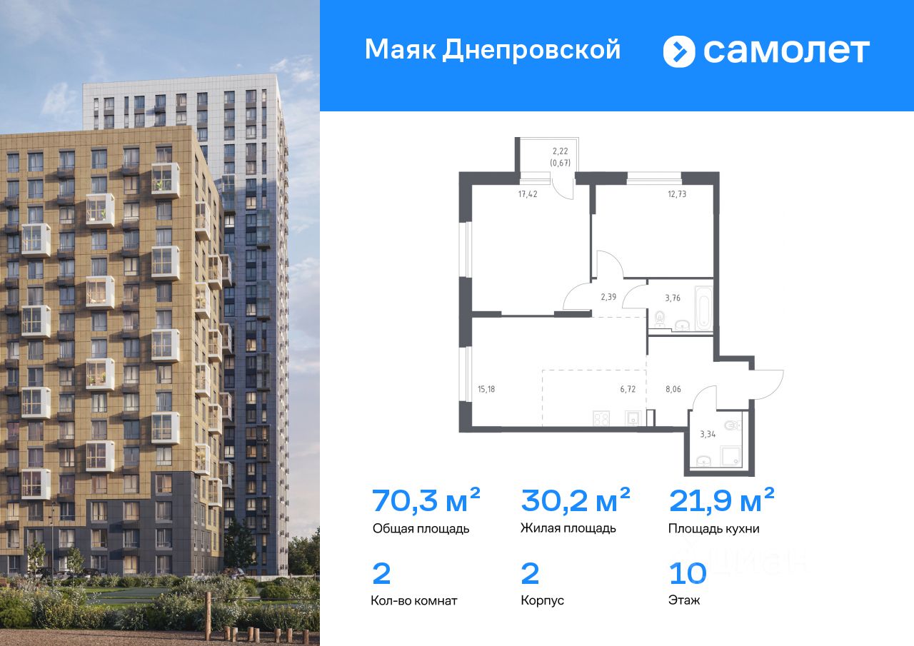 Строим кварталы для жизни с заботой о будущем. Предлагается 2-комнатная квартира комфорт-класса 70,27 кв.м в корпусе 2 на 10 этаже, в ЖК ''Маяк Днепровской'' Квартира с чистовой отделкой. Доступность дополнительных опций уточняйте у застройщика.