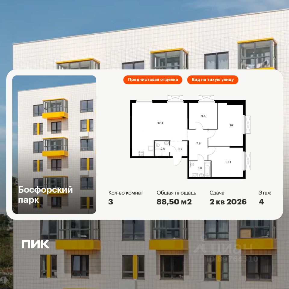 Продаётся 3-комн. квартира площадью 88,5 кв.м на 4 этаже 17 этажного дома (Корпус 5, Секция 1) проекта ПИК Босфорский парк. Светлый просторный подъезд на уровне земли, функциональная планировка, большие окна, предчистовая отделка.