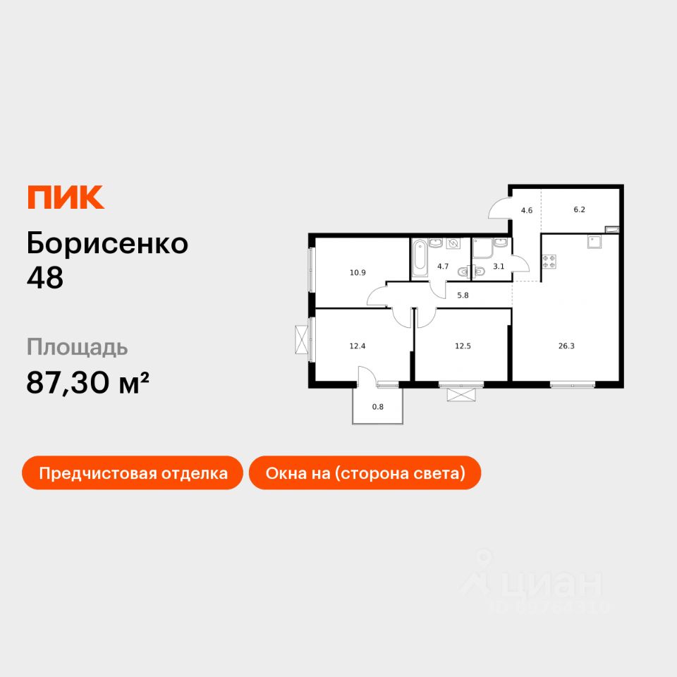 Продаётся 3-комн. квартира площадью 87,3 кв.м на 12 этаже 17 этажного дома (Корпус 3, Секция 3) проекта ПИК Борисенко 48. Светлый просторный подъезд на уровне земли, функциональная планировка, большие окна, предчистовая отделка.