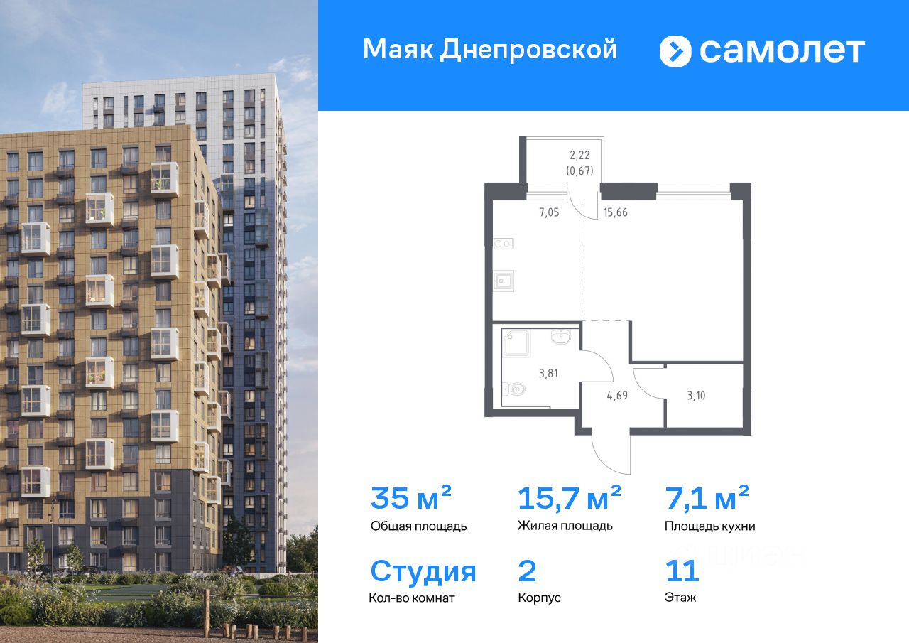 Строим кварталы для жизни с заботой о будущем. Предлагается квартира студия комфорт-класса 34,98 кв.м в корпусе 2 на 11 этаже, в ЖК ''Маяк Днепровской'' Квартира с чистовой отделкой. Доступность дополнительных опций уточняйте у застройщика.