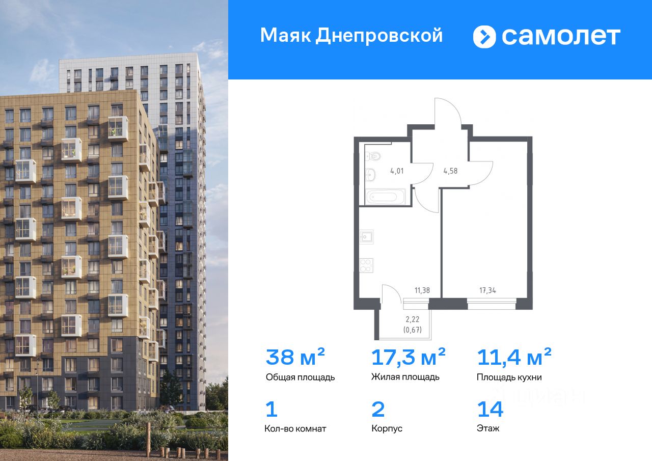 Строим кварталы для жизни с заботой о будущем. Предлагается 1-комнатная квартира комфорт-класса 37,98 кв.м в корпусе 2 на 14 этаже, в ЖК ''Маяк Днепровской'' Квартира с предчистовой отделкой. Доступность дополнительных опций уточняйте у застройщика.