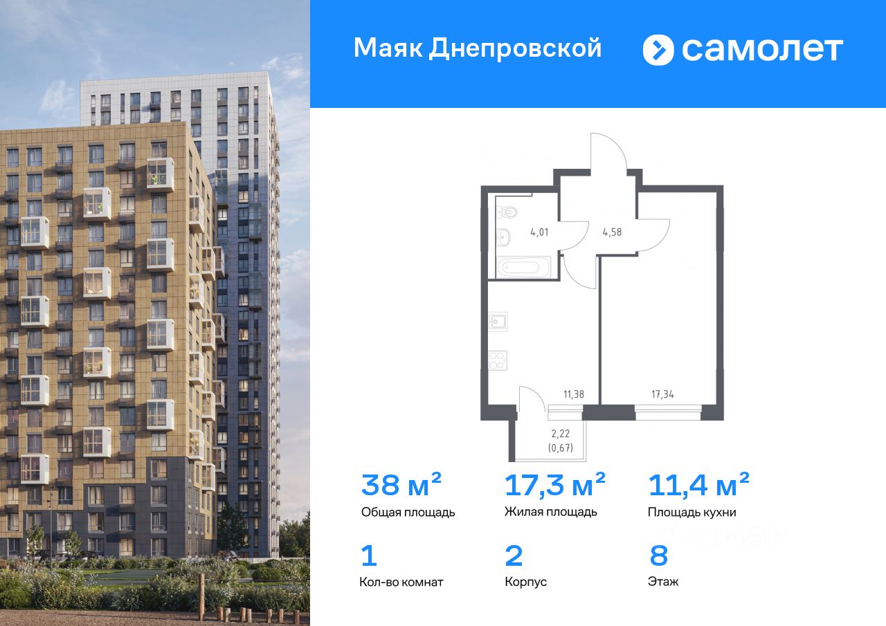 Строим кварталы для жизни с заботой о будущем. Предлагается 1-комнатная квартира комфорт-класса 37,98 кв.м в корпусе 2 на 8 этаже, в ЖК ''Маяк Днепровской'' Квартира с чистовой отделкой. Доступность дополнительных опций уточняйте у застройщика.