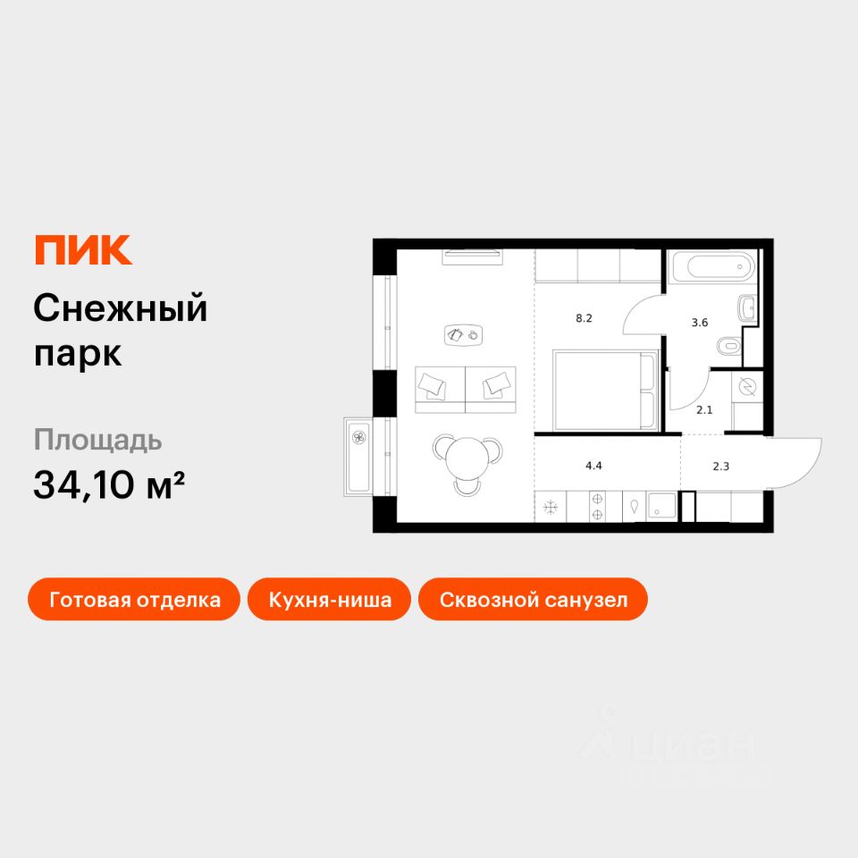 Продаётся 1-комн. квартира площадью 34,1 кв.м на 9 этаже 25 этажного дома (Корпус 4, Секция 2) проекта ПИК Снежный парк. Светлый просторный подъезд на уровне земли, функциональная планировка, большие окна, c отделкой.