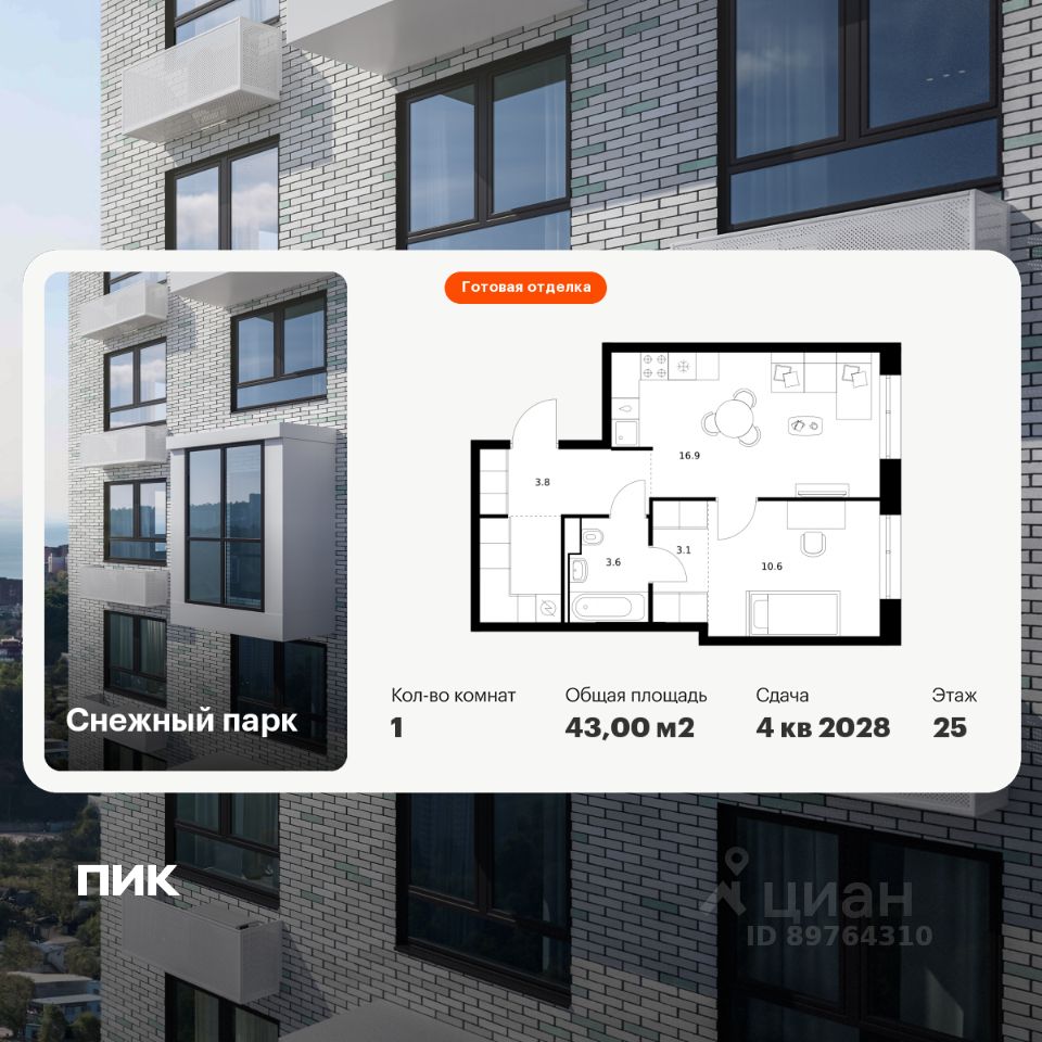 Продаётся 1-комн. квартира площадью 43 кв.м на 23 этаже 25 этажного дома (Корпус 4, Секция 2) проекта ПИК Снежный парк. Светлый просторный подъезд на уровне земли, функциональная планировка, большие окна, c отделкой.