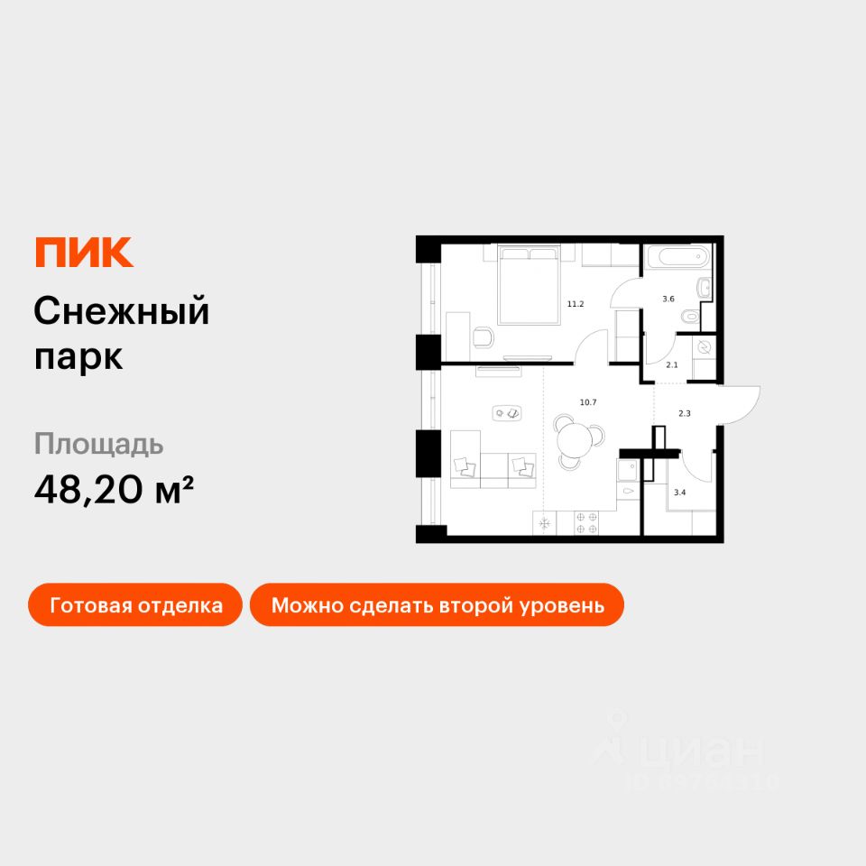 Продаётся 1-комн. квартира площадью 48,2 кв.м на 2 этаже 25 этажного дома (Корпус 4, Секция 2) проекта ПИК Снежный парк. Светлый просторный подъезд на уровне земли, функциональная планировка, большие окна, c отделкой.