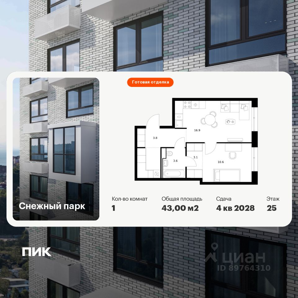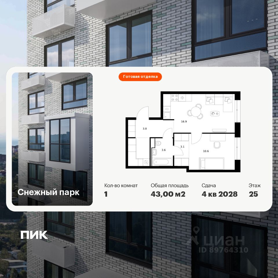 Продаётся 1-комн. квартира площадью 43 кв.м на 16 этаже 25 этажного дома (Корпус 4, Секция 2) проекта ПИК Снежный парк. Светлый просторный подъезд на уровне земли, функциональная планировка, большие окна, c отделкой.
