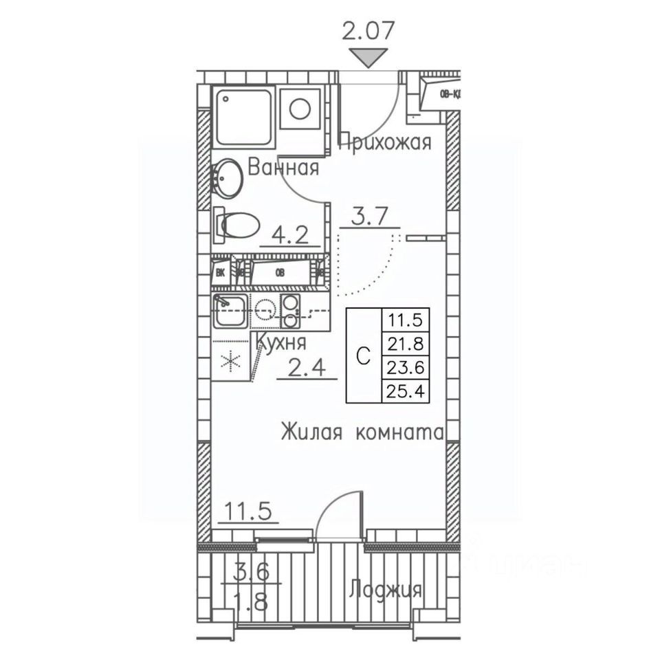 Общая площадь25,4 м2