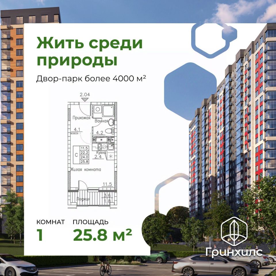 Продается студия в ЖК ''Гринхилс''. Отделка - whitebox, санузел - под ключ. Общая площадь квартиры — 25.8 кв. м, этаж 19 из 19. Тип дома — монолитный. Цена указана при 100% оплате.