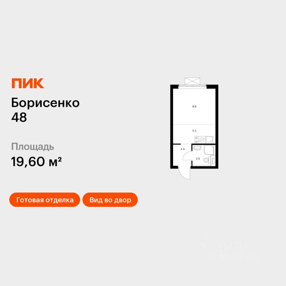 Продаётся квартира-студия площадью 19,6 кв.м на 6 этаже 17 этажного дома (Корпус 1, Секция 1) проекта ПИК Борисенко 48. Светлый просторный подъезд на уровне земли, функциональная планировка, большие окна, c отделкой.