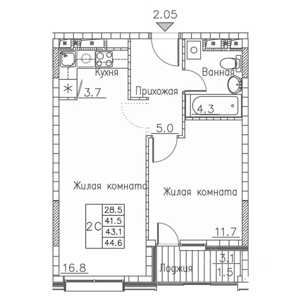 Общая площадь44,6 м2