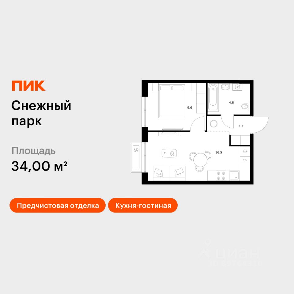 Продаётся 1-комн. квартира площадью 34 кв.м на 16 этаже 25 этажного дома (Корпус 3, Секция 1) проекта ПИК Снежный парк. Светлый просторный подъезд на уровне земли, функциональная планировка, большие окна, предчистовая отделка.