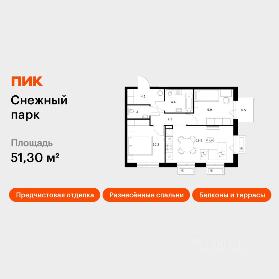 Продаётся 2-комн. квартира площадью 51,3 кв.м на 13 этаже 25 этажного дома (Корпус 3, Секция 1) проекта ПИК Снежный парк. Светлый просторный подъезд на уровне земли, функциональная планировка, большие окна, предчистовая отделка.
