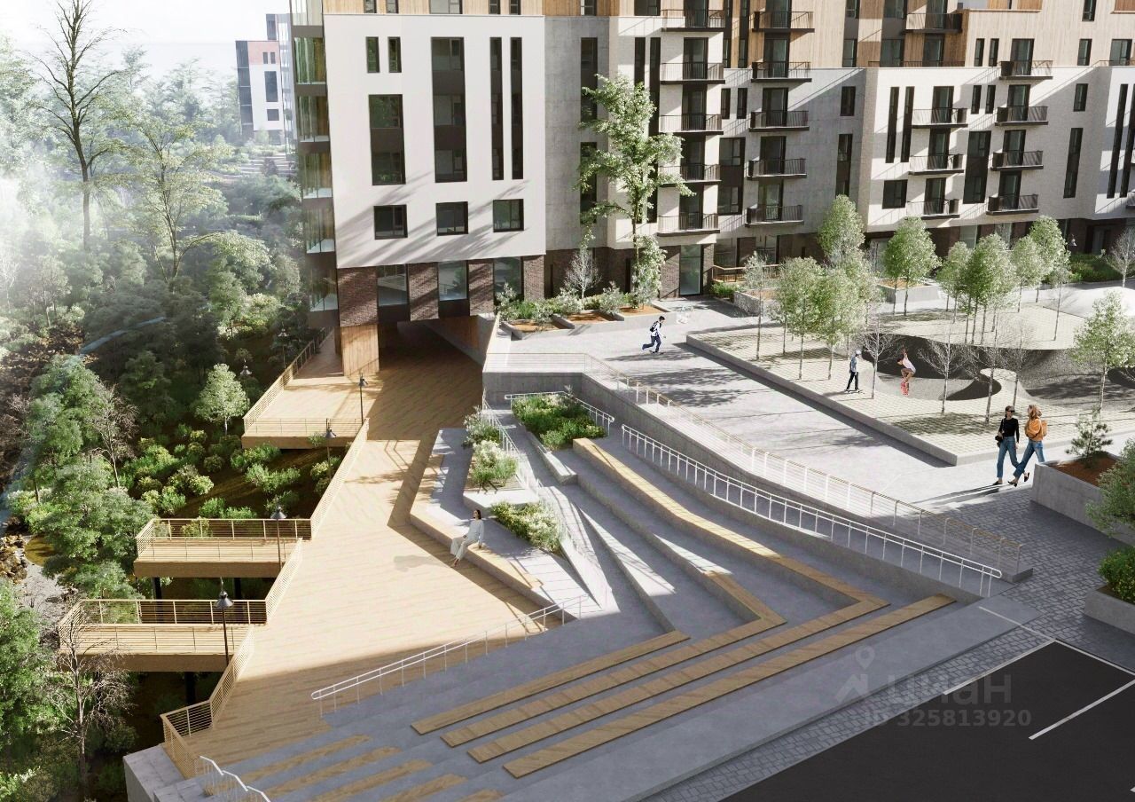 Проект отличается продуманным ландшафтом и общественными пространствами: •собственная набережная вдоль реки •амфитеатр и видовые площадки •свободный Wi-Fi по всей территории •большое количество зон отдыха и детских площадок.