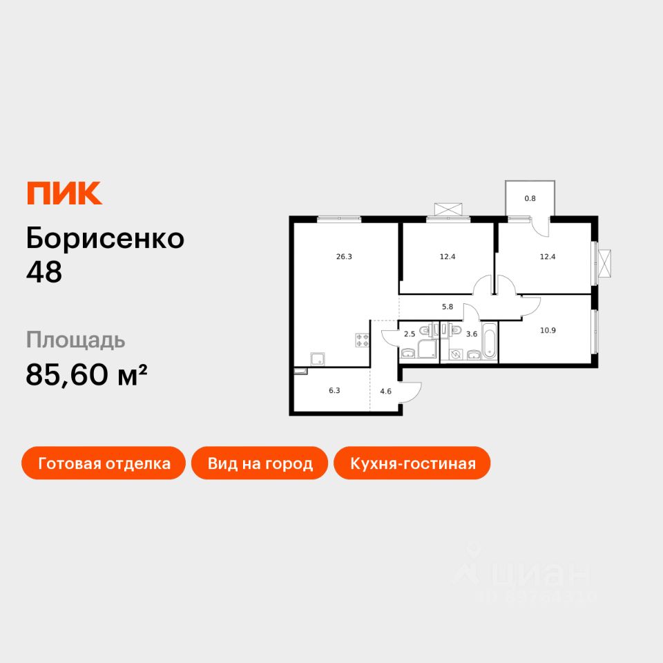 Продаётся 3-комн. квартира площадью 85,6 кв.м на 8 этаже 17 этажного дома (Корпус 1, Секция 1) проекта ПИК Борисенко 48. Светлый просторный подъезд на уровне земли, функциональная планировка, большие окна, c отделкой.