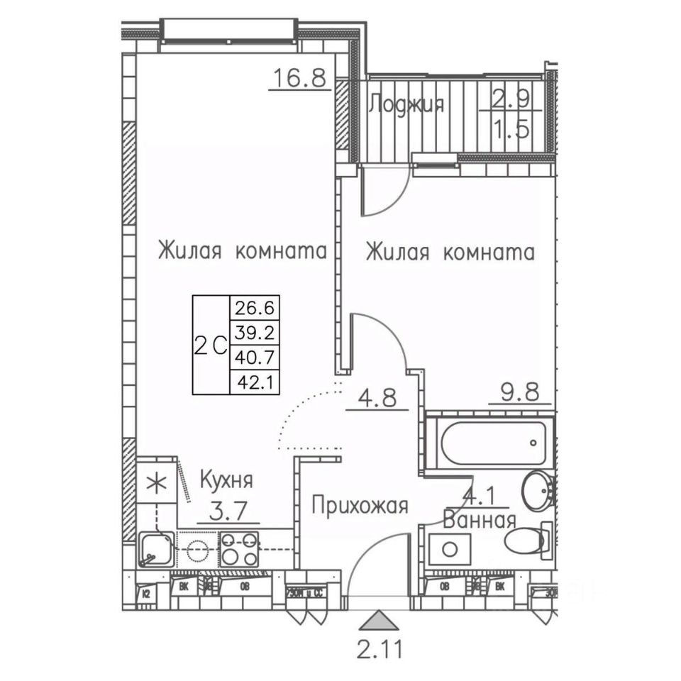 Общая площадь42,1 м2