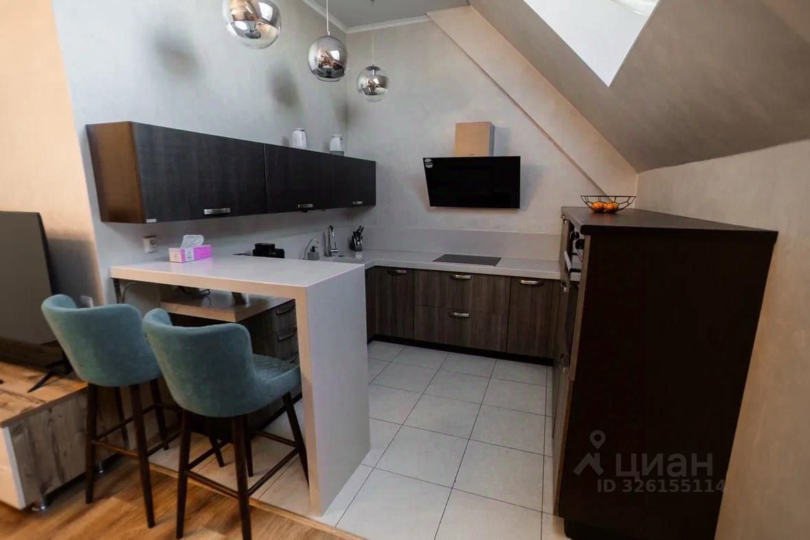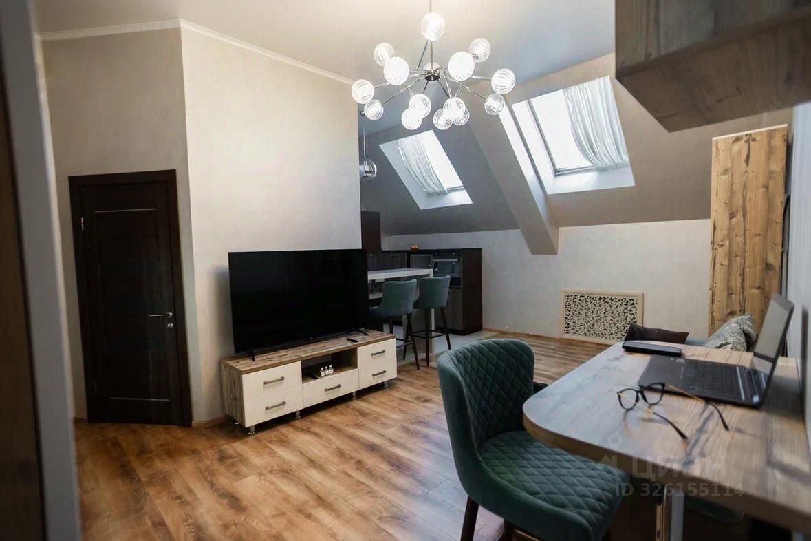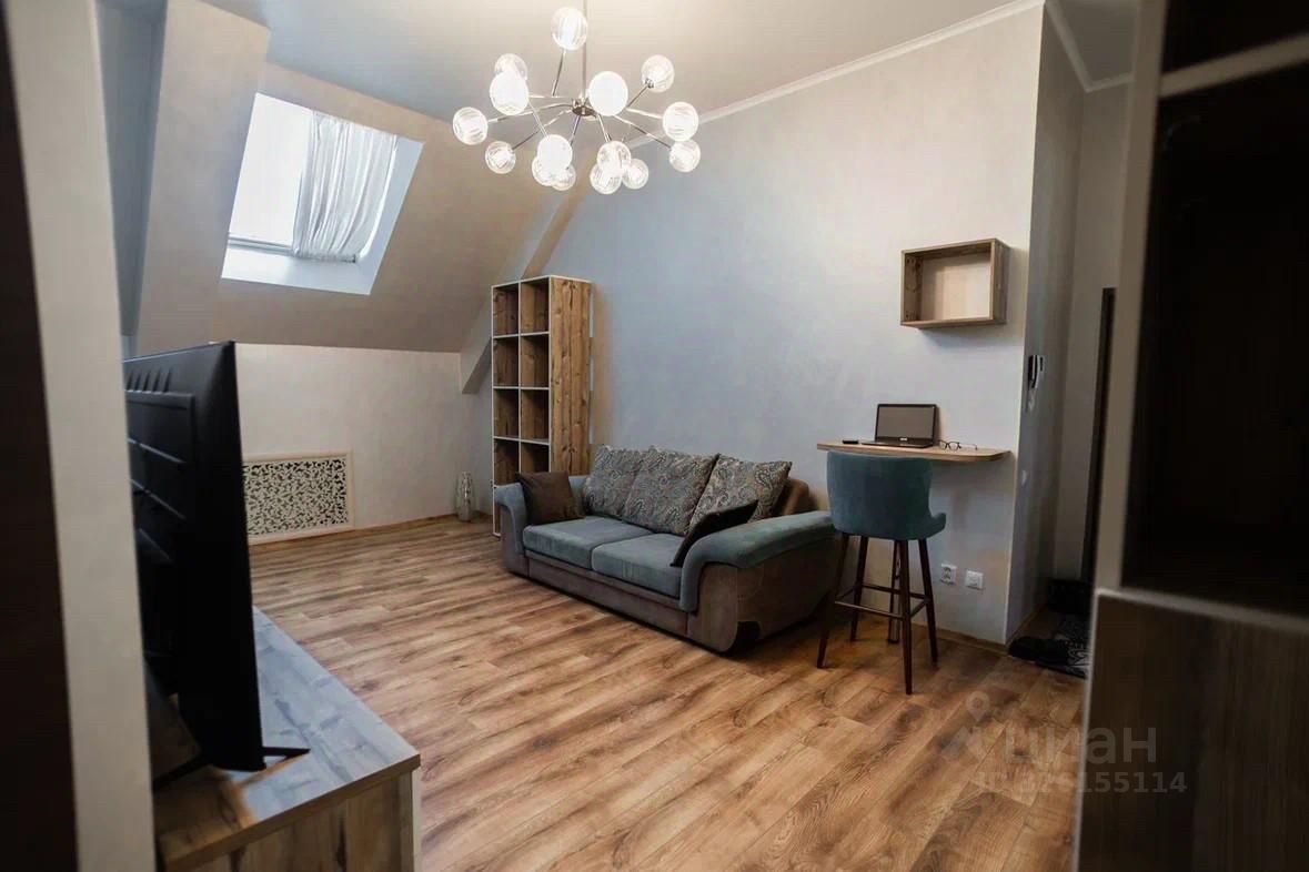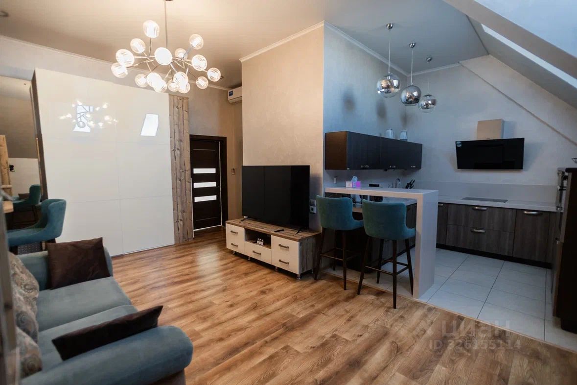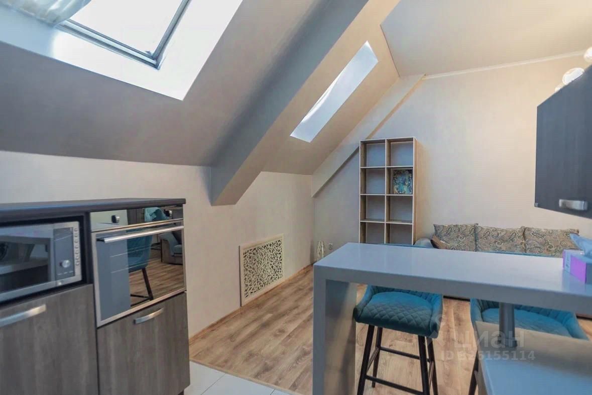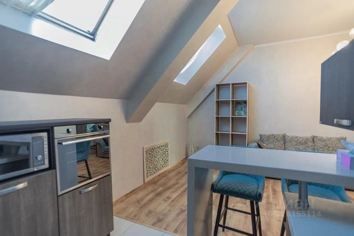 Планировка включает отдельную спальню и просторную кухню-гостиную, идеально подходящую как для отдыха, так и для приёма гостей. Изюминка квартиры — высокие потолки и мансардный этаж: одна из стен скошенная, за счёт чего пространство выглядит необычно, современно и визуально ещё более объёмным. В гостиной пол с подогревом. Квартира светлая, чистая и с приятной атмосферой.