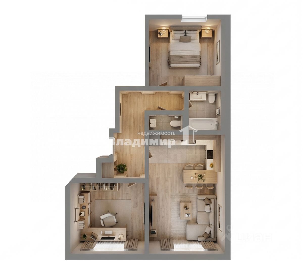 Удобная планировка: просторная кухня-гостиная, две раздельные комнаты, раздельный санузел.
