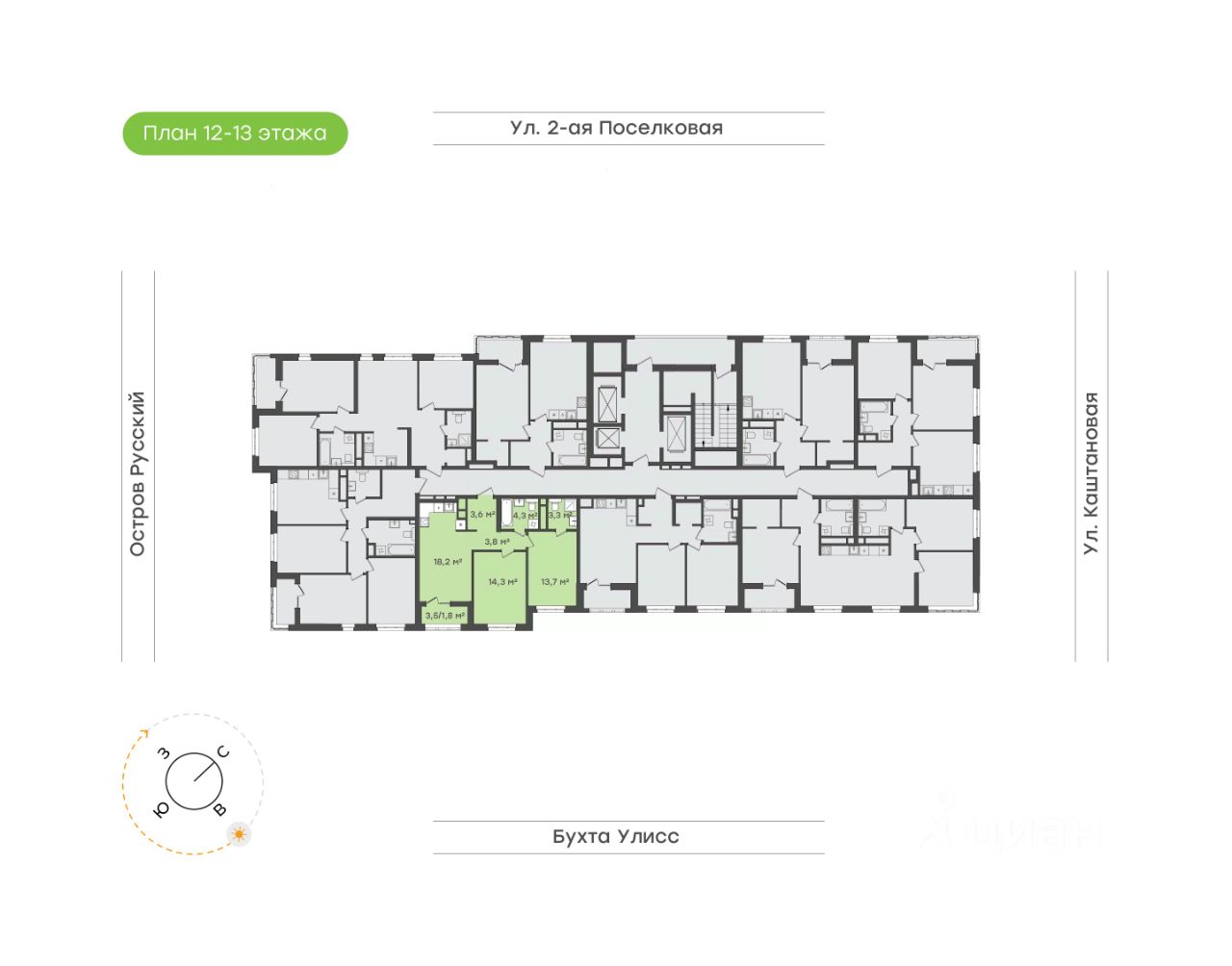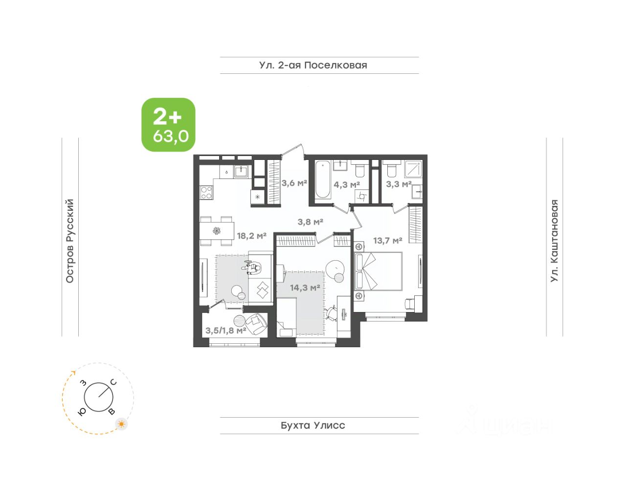 2,5-комнатная с мастер-спальней комфорт для всей семьи Прихожая 3,6 кв.м с местом для шкафа Просторная кухня-столовая 18,2 кв.м с лоджией подойдет как для тихих семейных вечеров за просмотром фильмов в домашнем кинотеатре, так и для шумного приема гостей Уютная детская 14,3 кв.м, где можно грамотно разделить зоны для занятий и отдыха Спальня 13,7 кв.м с собственной ванной комнатой максимальный комфорт для родителей Общая ванная комната 4,3 кв.м с местом под стиральную машину