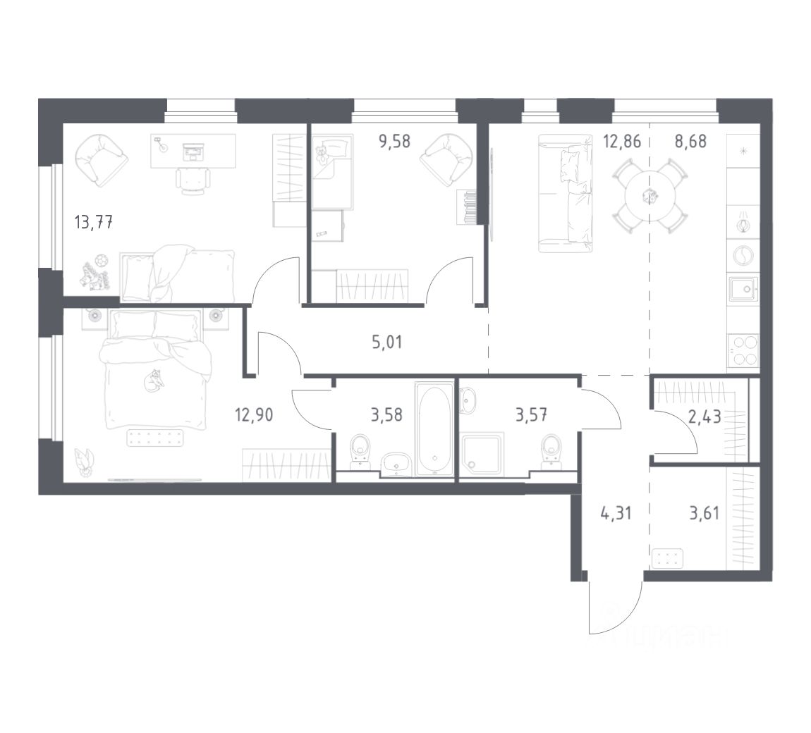 Строим кварталы для жизни с заботой о будущем. Предлагается 3-комнатная квартира комфорт-класса площадью 80.3 кв.м в корпусе 5КВ на 6-м этаже, в жилом комплексе ''Квартал Нейбута''.