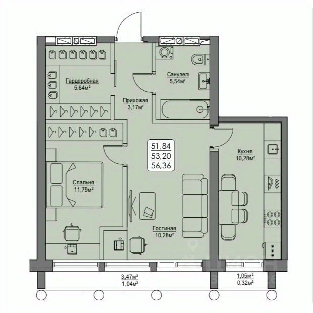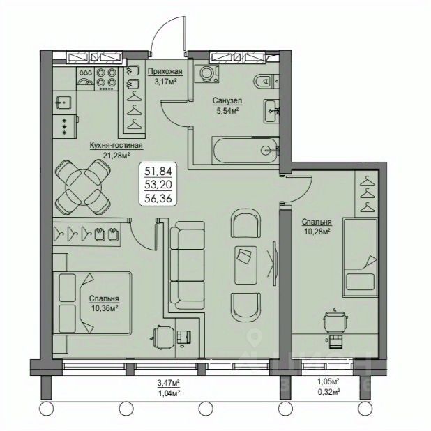 Общая площадь53,2 м2