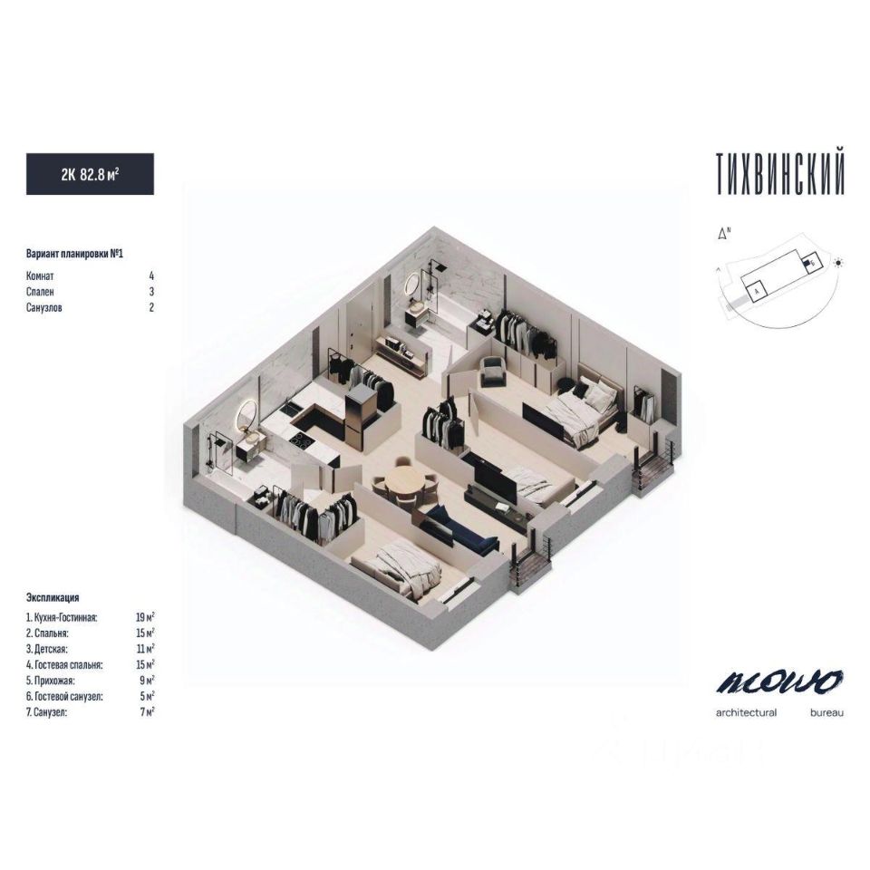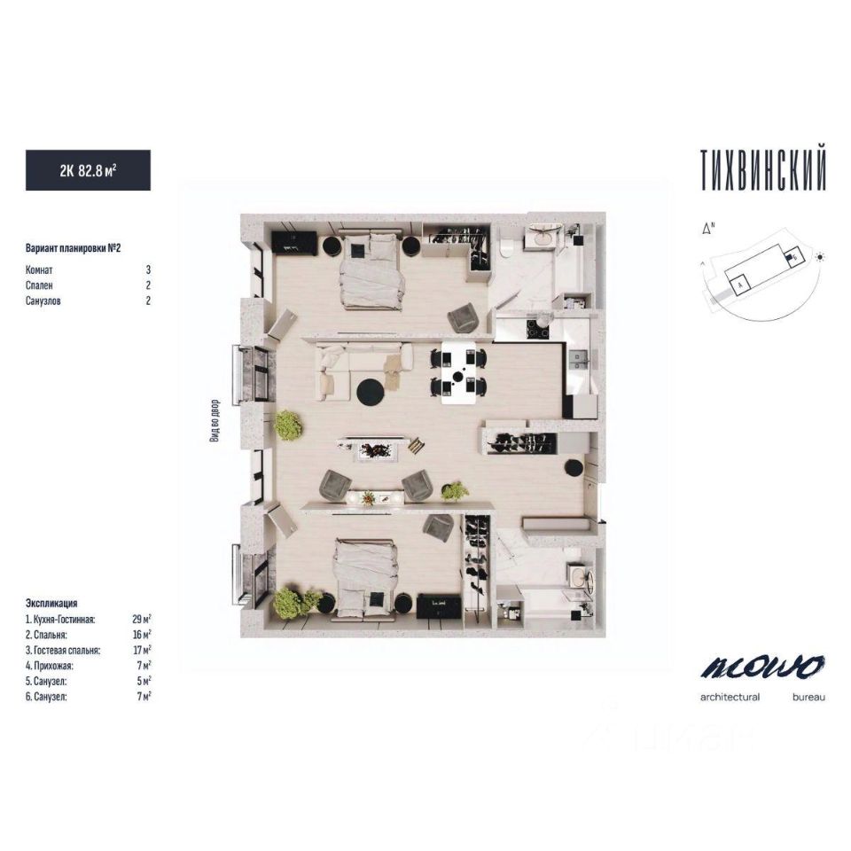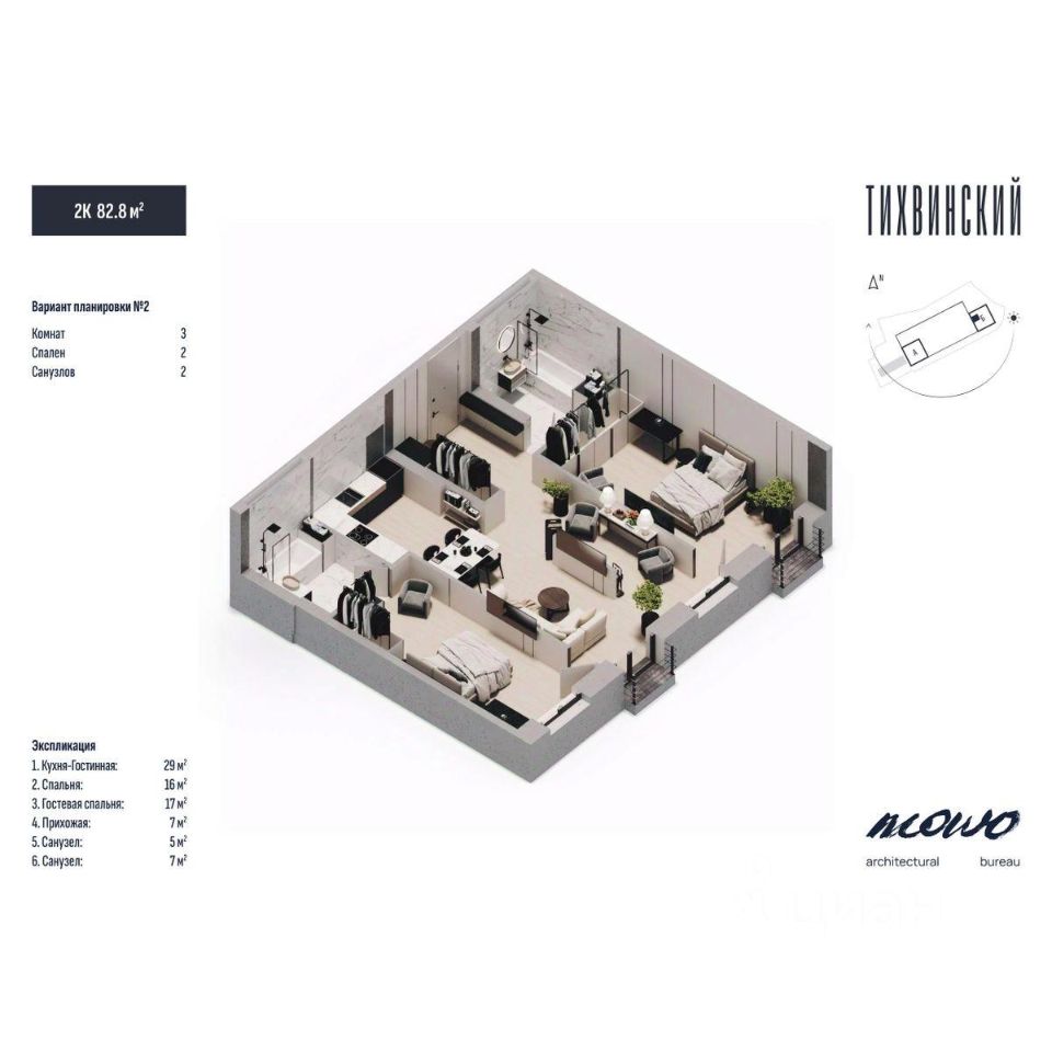 Тихвинский состоит из двух 29 этажных домов, объединенных стилобатной частью, в которой находится подземный паркинг.