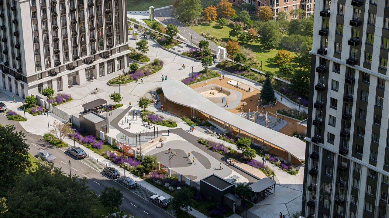 Придомовая территория доступна только жителям. Аллея дружбы. Площадка для стритбола. Детские игровые комплексы в эко стиле. Велопарковка. Дог-парк. Уличные тренажёры и площадка для йоги.